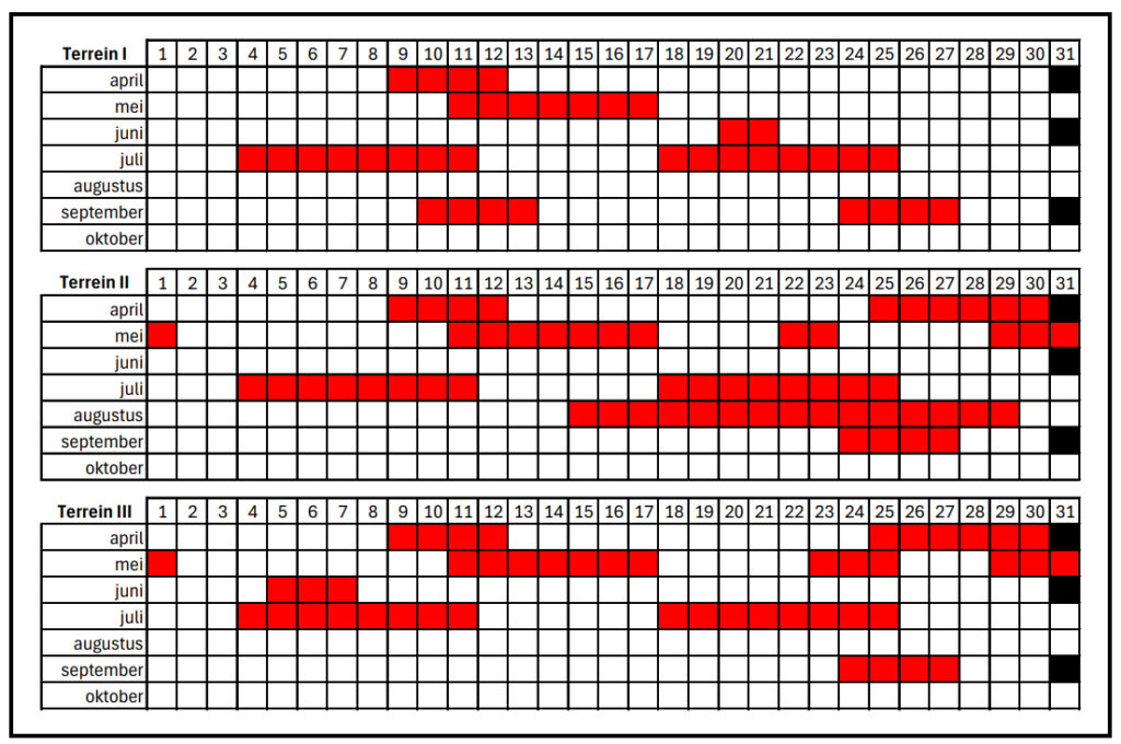 In het overzicht hieronder geven we aan welke terreinen wanneer verhuurd zijn.